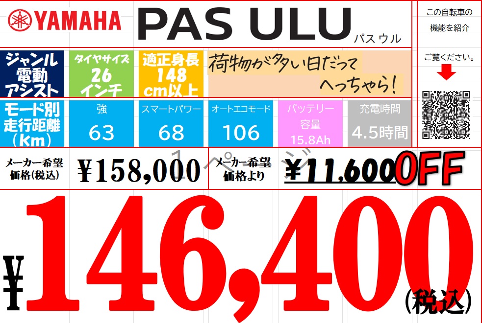 店舗:瑞江店 車種:電動アシスト シティモデル メーカー:YAMAHA 在庫数:1台 店頭販売 店頭受取価格:146,400円 ネット販売 店頭受取価格:- ネット販売 自宅配達価格:139,400円 お問い合わせ番号:10004334